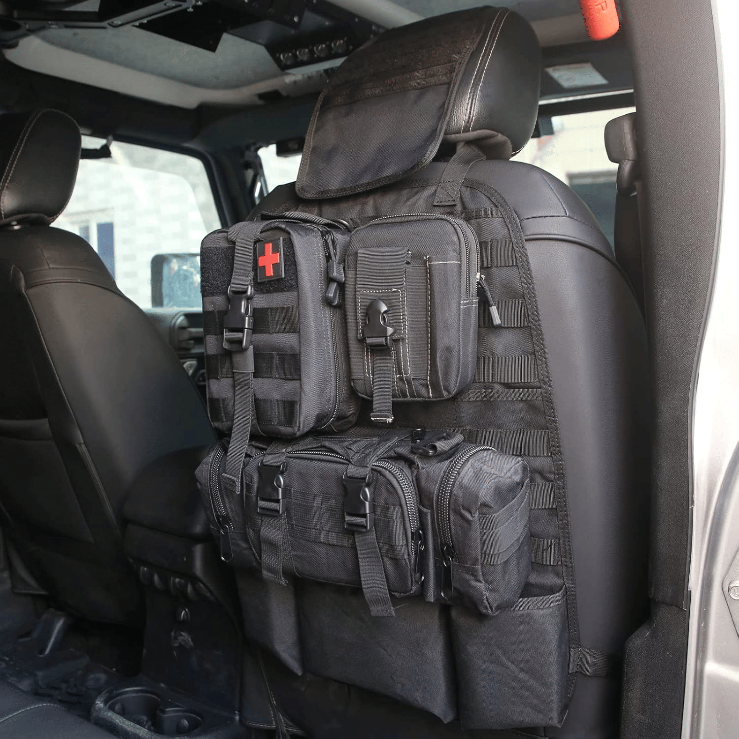 Organizer with 3 Packet: The car back seat organizer design of multiple storage compartments holds your books, ipad,and tactical gear.Medical pouch holds your first aid supplies. Phone pouch holds your phone. 3 Different Size Admin pouch holds tactical gear or Depends on your preference