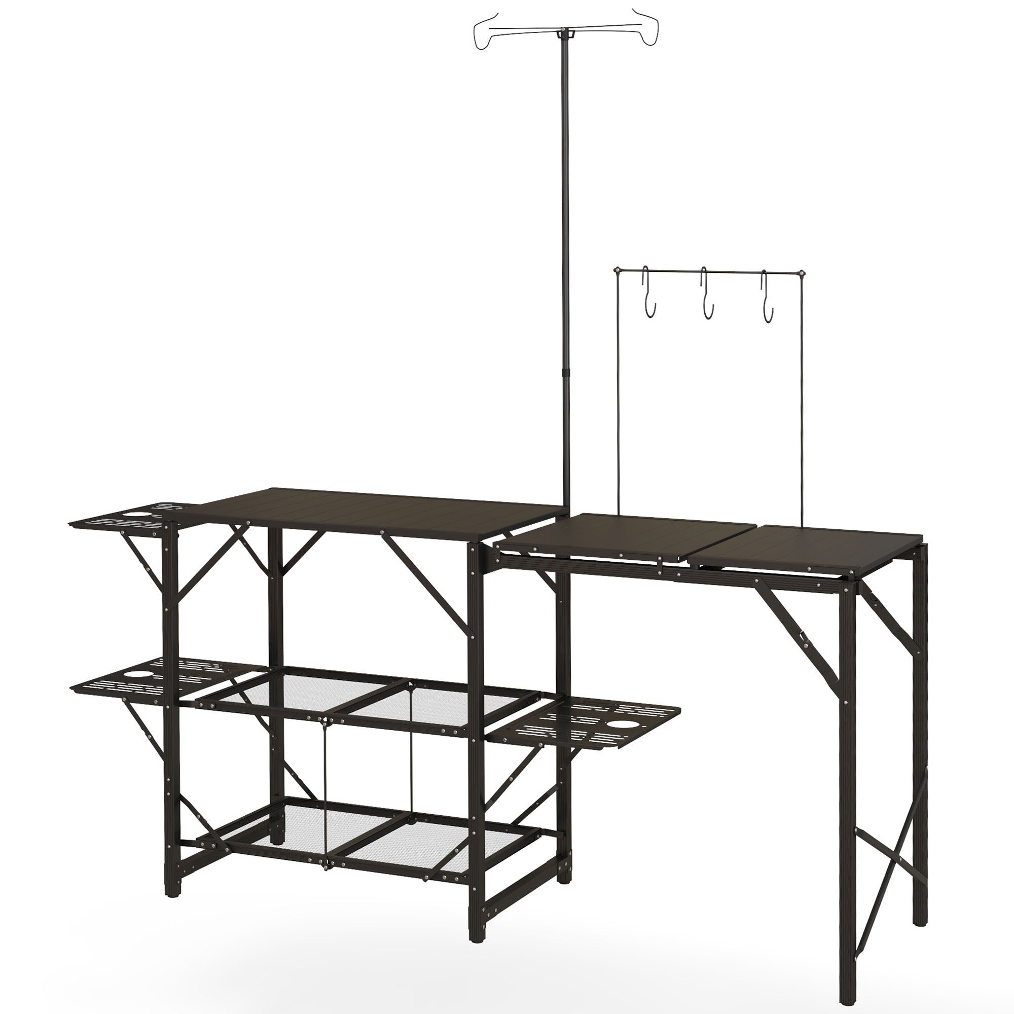 Elevate your camping experience with the Outsunny camp table! Enjoy a clutter-free cooking space with 2 tables, 2 bottom shelves, and 3 foldable side shelves, making it your go-to outdoor cooking station. With 4 hooks for your utensils and an adjustable lamp stand, this folding camping table transforms into a great cooking table. Plus, it's a breeze to transport with its folding design and carrying bag.
